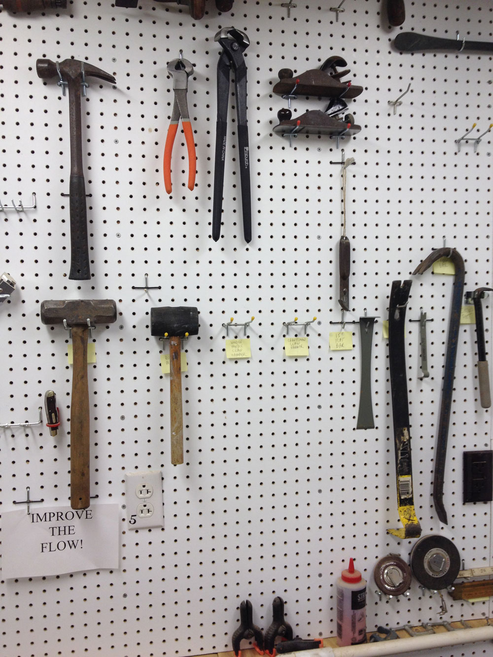 If the surface has a finish compatible with alcohol, wipe gently to remove all traces of oil. For painted surfaces, such as pegboard, a degreasing cleaner such as Formula 409 works well. Rebuilding my shop after Hurricane Katrina, 2005, I am still not committed to all of the locations of hanging tools and jigs, so I need my Post-It Notes to keep a good grip until I'm 100% sure of the final residing place of each item.