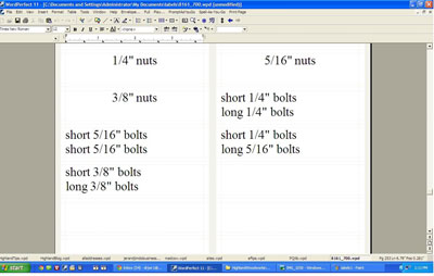 I also started over with a new warren of plastic drawers. For now, each one has a temporary Note designating its contents. When the time is right for permanent labels, Avery makes it easy. Templates already exist in Word, Word Perfect and Open Office.