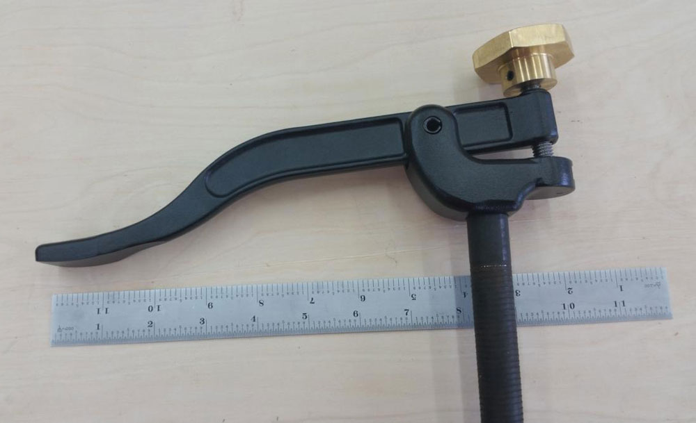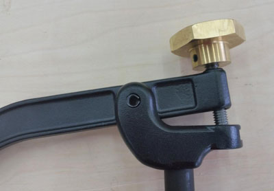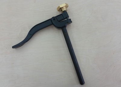 To me, the key to this hold-down is the unique clamping mechanism and over-sized brass knob. After you insert the post into a 3/4" dog hole on your bench and press the arm down onto the piece to be clamped you simply twist the knob a turn or two to apply a surprising amount of clamping pressure.