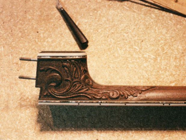 Each set consisted of a Resonator, and the neck, carved on both the peg head and the heel. For information on these models, contact OME Banjo. The resonator above is walnut. The neck pictured below is Rosewood.
