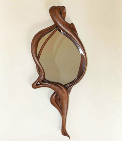 This is glued up from timbers about 3" x 4", strategically dodging bolt holes in areas to be sawed off. I band-sawed the middle out before the final glue-up of the right and left halves. The whole frame is about 34" high. I put a hardwood spline in the back of the thin part that goes across the mirror in the upper left.