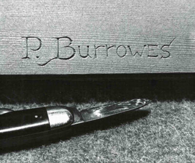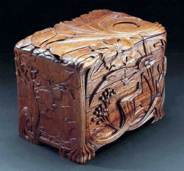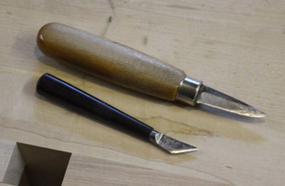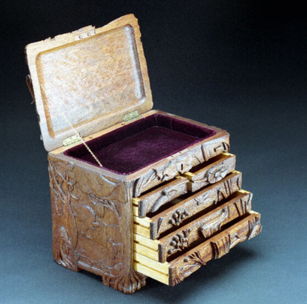 The chest below was carved largely with these, and more that I have added over the years. At the time I was living on very limited means, and had no space for a workshop anyway. The joinery for this was done out on the porch, with my skill-saw mounted upside down in a plywood box, and of course hand tools. The two brass nubs visible near the hinges when the lid is open, are the tips of a spring-loaded ladder soldered together with hooks which engage eyes on the backs of the drawers to lock the chest when the lid is closed. When the lid opens, this same mechanism starts a music box hidden in the bottom. The high relief features on the front form the pulls for the drawers. The wood is mahogany. There are more photos of this on my web site.