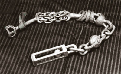 This next one is a fairly early chain, done sometime in my mid-teens. It's not the first, but it's the earliest survivor. I started on the tri-hook end. The cage has eight bars. As you can see, there is one major mistake: Before freeing the ball, all work to make it as round as possible must be complete before freeing the ball on the ends, because after it's free, it's pretty much impossible to hold on to it with sufficient grip to do any further carving.