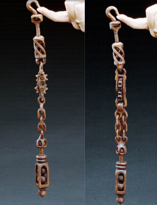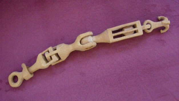 The chain below was carved over a period of about two and a half weeks. I started at the end with the double ball-in-cage, followed by two captive rings. Next is a swivel ball and socket joint, then a twin chain section, followed by the gears, which work. Above the spiral cage, a shaft connects to a block inside, which slides in a helical motion. Above that, the hook is connected with a conventional swivel joint.