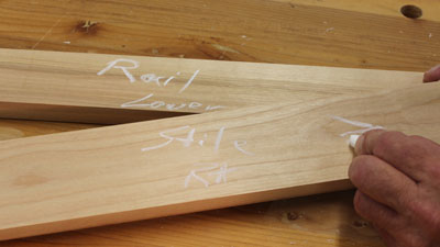 Label everything. A week from now (or even tomorrow morning) you may not remember which boards were the fronts and backs of drawers and which were the sides. It may be difficult to remember the order and layout of boards intended for a panel glue-up or what pieces were intended for aprons and which for stretchers. Chalk is great. It wipes off easily, shows well on most woods, and will not interfere with finishing later on.