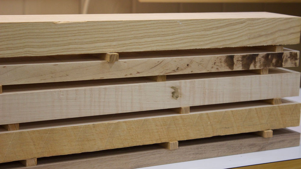 Protect some woods from light. All wood changes color slightly with exposure to light, but some darken noticeably and rather quickly. If you will be out of the shop for a while, you might be distressed to see light and dark areas on that beautiful cherry you milled a few weeks ago. I once left some cherry boards haphazardly arrayed on a workbench, and a few days later, each board had lighter colored stripes where other boards had laid across, shading the light. Stack the boards and throw a drop cloth or blanket over the batch to avoid selective or spotty darkening.