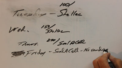 Finishing, particularly for weekend warriors, requires special strategies. You may not remember next week or next month whether you have put on three coats or two, whether you last sanded with 120 grit or 180, if the top has had three coats and the sides just two, or was it the other way 'round? The easy thing here is to just keep notes. My wipe-off marker board is ideal, a notebook will work, too.