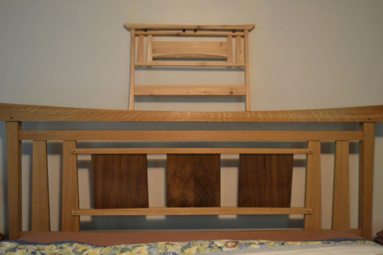 Having already deviated from my wood choice, I set about determining if the walnut should be used in the same style panel or if the design needed to be altered as well. My original design played off the relatively straight grain of the quartersawn white oak. The walnut stock had completely different grain with the end of the board even having a bit of a crotch effect. The options became clear: spend time and money getting more quartersawn white oak or re-work the central theme of the headboard design. However, once I had opened the possibility of change, the curiosity to see where this was going to lead carried the day. I stepped back from the workbench and instead, picked up the pencil.
