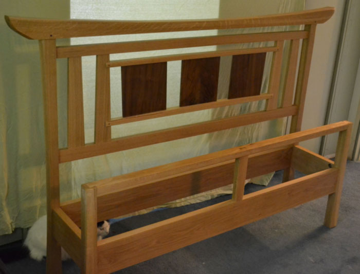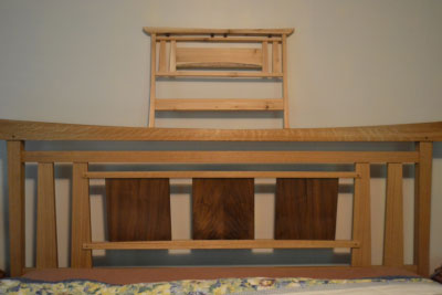 Building the headboard is a journey of mortise and tenons. Dutifully, I plug along, roughing out the mortises with my drill press and finishing them up with hand chopping. The tenons are all cut by hand and trued up with shoulder plane and rabbeting block plane. I kept all of the stock square to simplify the joiner process. I hadn't template routed before, but chose that method to produce the gentle upsweeping curve on the top rail and the uprights. The methods work well and I really enjoy detailing these surfaces with drawknife and spokeshave to provide a visual interest and a tactile pleasure.