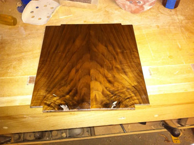 It only took six lines to begin the path to a solution of integrating walnut panels into the design. I quickly saw the "crotch" portion of the board could be bookmatched and would form a central panel running vertically. Then to either side would be walnut panels with their grain running a bit at an angle. To avoid too much uniformity, I played around with the outer edges of the left and right panels being either curved or at least angled away from the vertical.