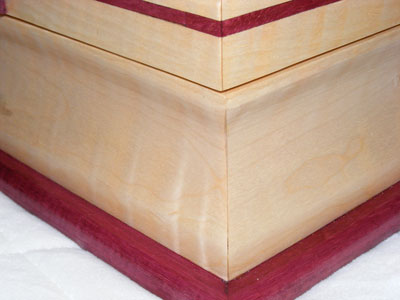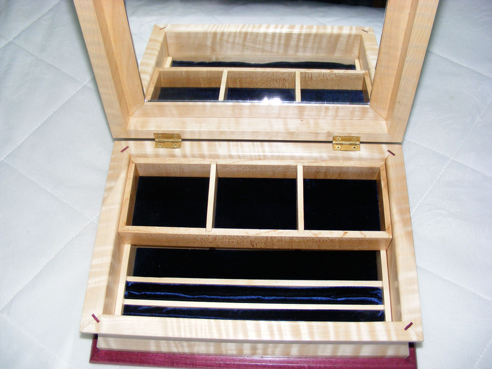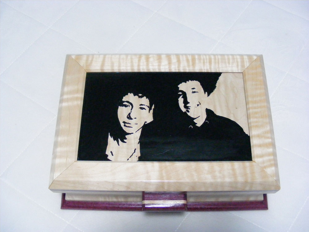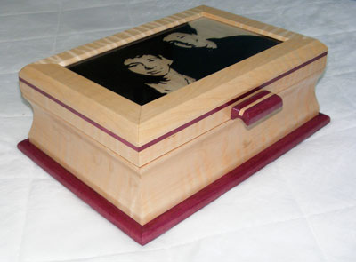 This jewelry box is made of Tiger Maple and Purpleheart. My 2 grandsons are on the top, hand painted on glass and then turned upside down and installed in the top of the box.