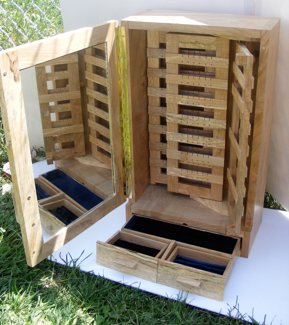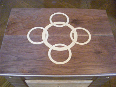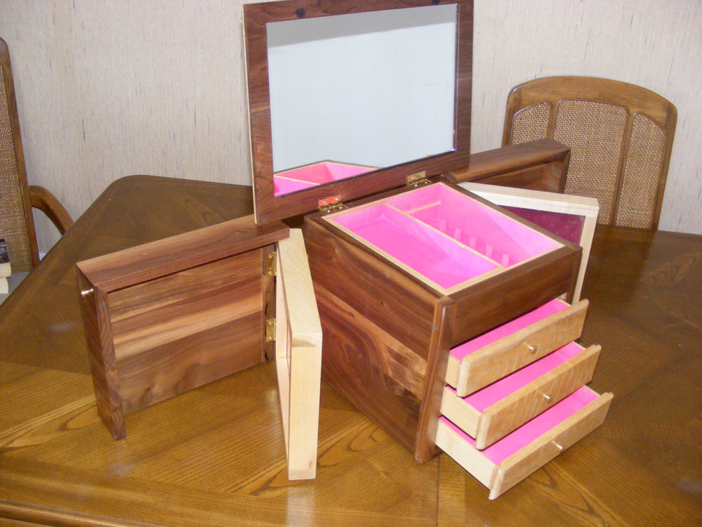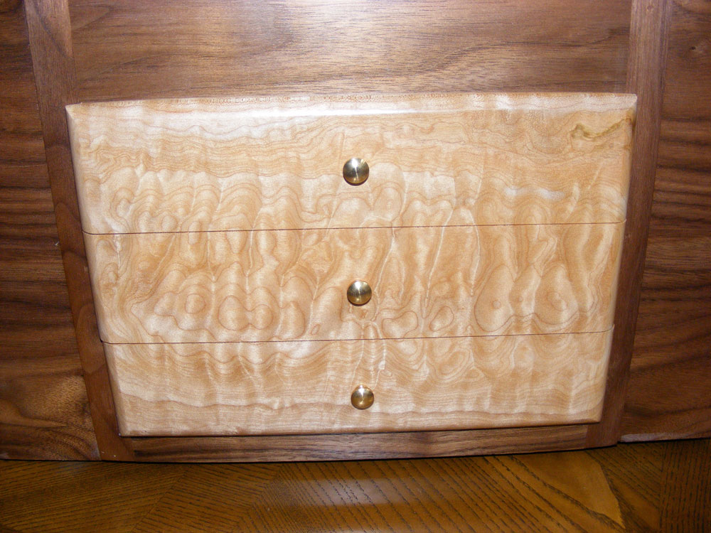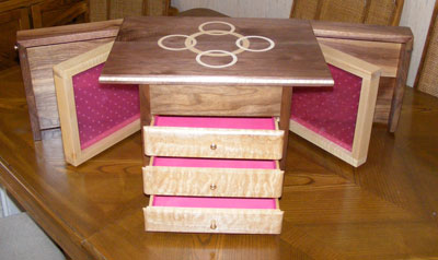 Below is another jewelry box made of Black Walnut. The top inlay rings are Eastern Maple, as well as all of the interior drawers. The drawer faces are Quilt Maple. The inside of the boxes is coated with nylon flock. The earring holders on each side will hold a total of 142 earrings. It has 2 secret compartments in it as well.
