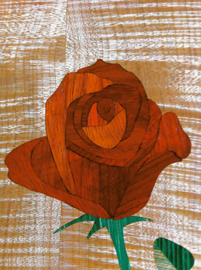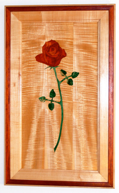 "The Rose In Bloom" below is my latest project. It is made from pieces of Paddock cut from same board just turned a little with each inlay to reflect light. The stem is Eastern Maple infused with acrylic color. The background is Tiger Maple. The finish is 2 coats of Shellac, and 5 coats of Minwax wipe-on Poly.