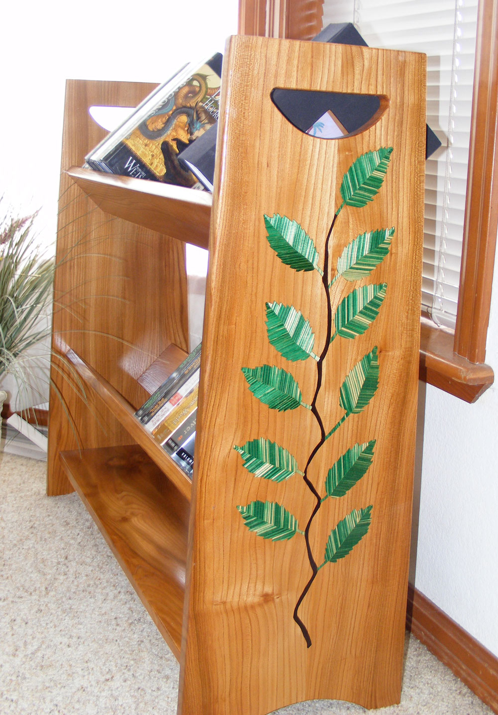 This shelf below is made from American Elm wood with an inlay of an American Elm branch on both ends. The inlay branch is Ipe, and the leaves are Eastern Maple infused with acrylic color.