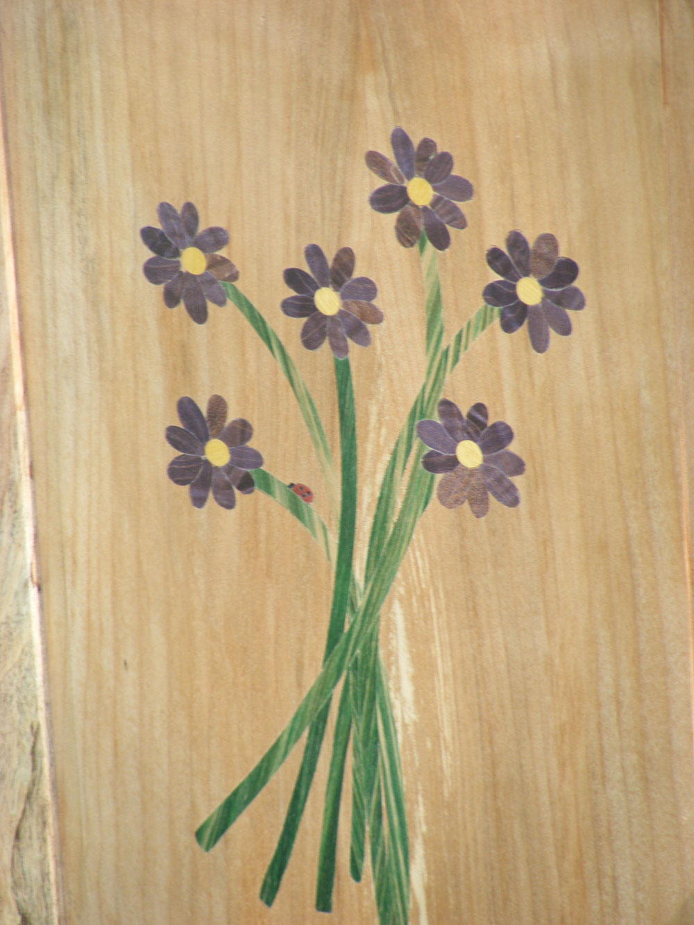 "Daisy Bouquet" - This is the face for a raised panel door to my granddaughter's Jewelry Box. Each flower is 9 separate inlays of Purple Heart. The center is Yellow Heart. The stem is Eastern Maple infused with acrylic color. The ladybug is Padouk with Ebony dots.