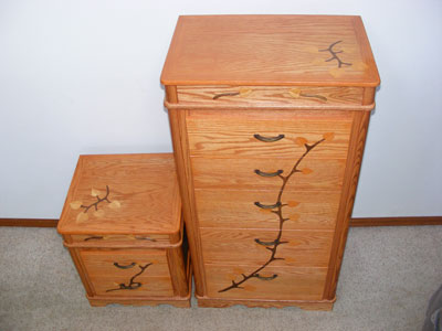 This dresser set below is made from Red Oak, which was milled down from 8/4 and 5/4 slabs. The vines on the drawer faces are Black Walnut with Douglas Fir leaves. The inlays have 8 coats of shellac. The cabinet has a Cherry stain, with 8 coats of wipe on satin polyurethane.