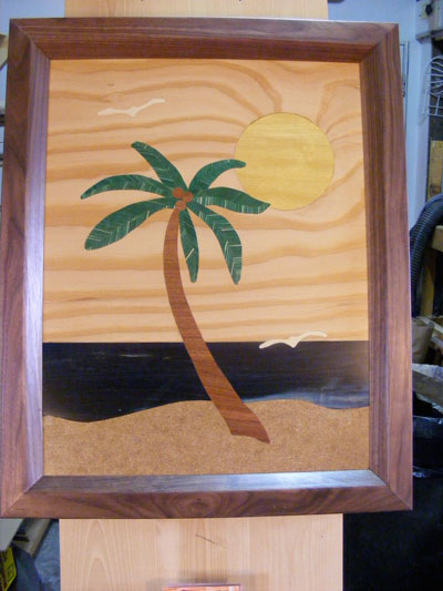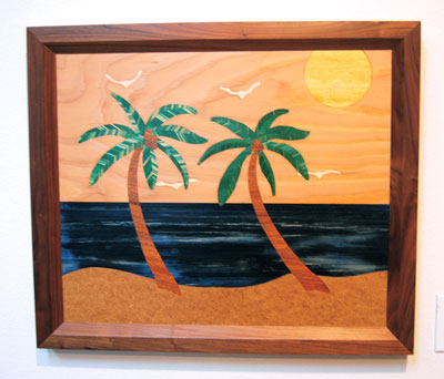 "Single Palm Tree" wall hanging. The frame is Black Walnut. The sky is Douglas Fir. The sun is Yellowheart. The seagulls are Bass wood. The palm fronds are Eastern Maple stabilized with acrylic and green dye. The palm trunk and the coconuts are both Pecan. The water is Eastern Maple stabilized with acrylic and blue dye. The sand is tempered hard board.