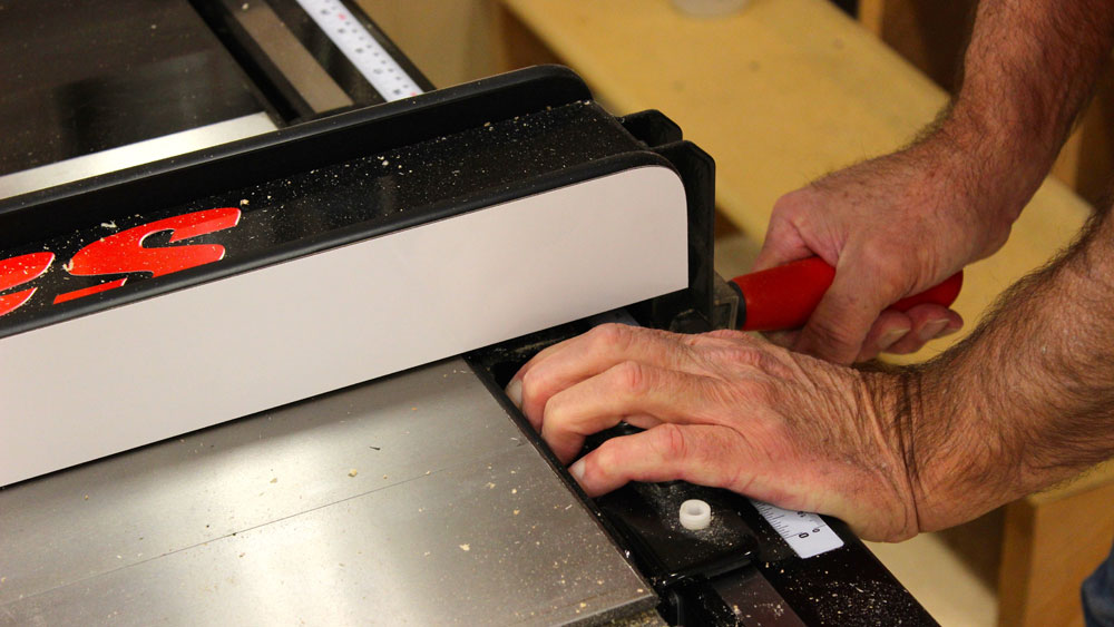 Changing from a regular blade to a dado stack and back is only mildly complicated by the need to change the brake cartridge. It is a few additional seconds, forty-five at most. And with each change comes an opportunity to blow the dust away from inner workings on the machine… always a good thing to do. I am very accustomed to cranking the blade to its highest setting to make a table saw blade change, but with the SawStop there is a lot of room inside and I have made blade changes without even resetting the cutting height.