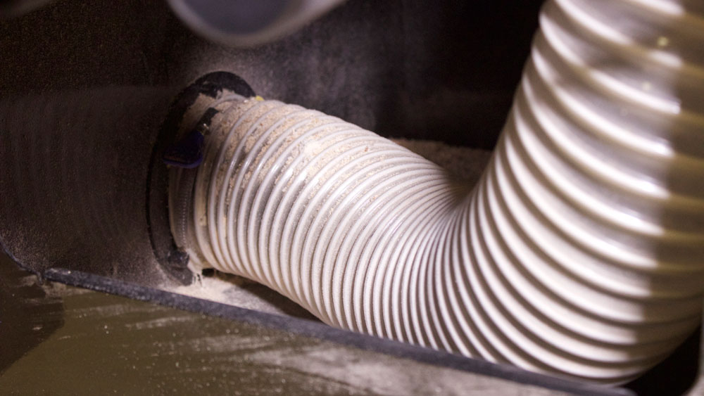 is so powerful that on many tools I have to partly open an additional blast gate so that the suction is not too great for the machine I am using. I had inadvertently left another gate partly open. The second time, however, it plugged with even the full, undiluted power of the JDS dust collector. The cause is likely the rather tight bend in the hose (see photo) combined with hogging out a high volume of material with a wide dado stack. It probably will never happen to most users. My advice, take it slow.
