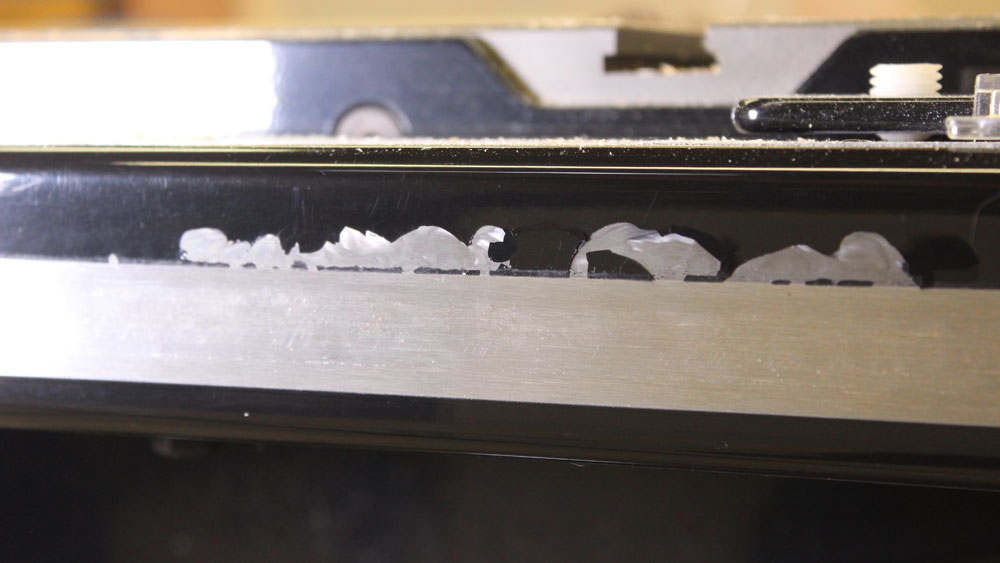 The square steel tube that attaches to the front of the saw provides the registration and mounting for the fence. On my saw, not yet a half-year old, the paint is coming off (see photo). At first I thought that maybe my belt buckle had inflicted the damage (why do I always assume it is something I did?), but my belt is too high (or my legs are too long), so this is just a flaw in the paint job. It's not the end of the world, but a minor annoyance on a machine in this price range.