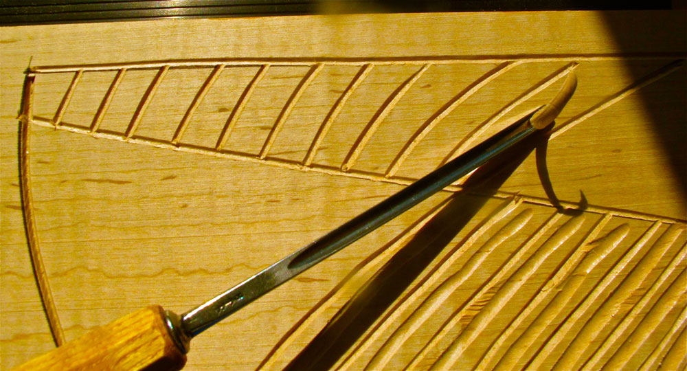 Here I'm utilizing the "V" tool to carve the curved lines. Again, I don't use layout tools during this part of the process. I like the small inconsistencies produced by eyeing these lines. Up close you can tell the lines were created using hand tools, and were not produced with a CNC machine. Too much precise layout looks too regimented and takes up unnecessary time to make.