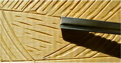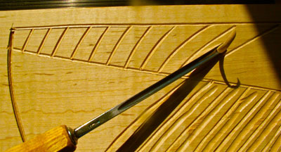 After the slightly curved vertical lines are cut, the next part is a play with pattern. You could simply leave the initial lines made with the "V" tool as your pattern. Here I take it one step further. Using an 8/7 gouge, I carve a shallow sweep between the curved, vertical lines. It adds one more level of carving for your eyes to explore once it is complete.