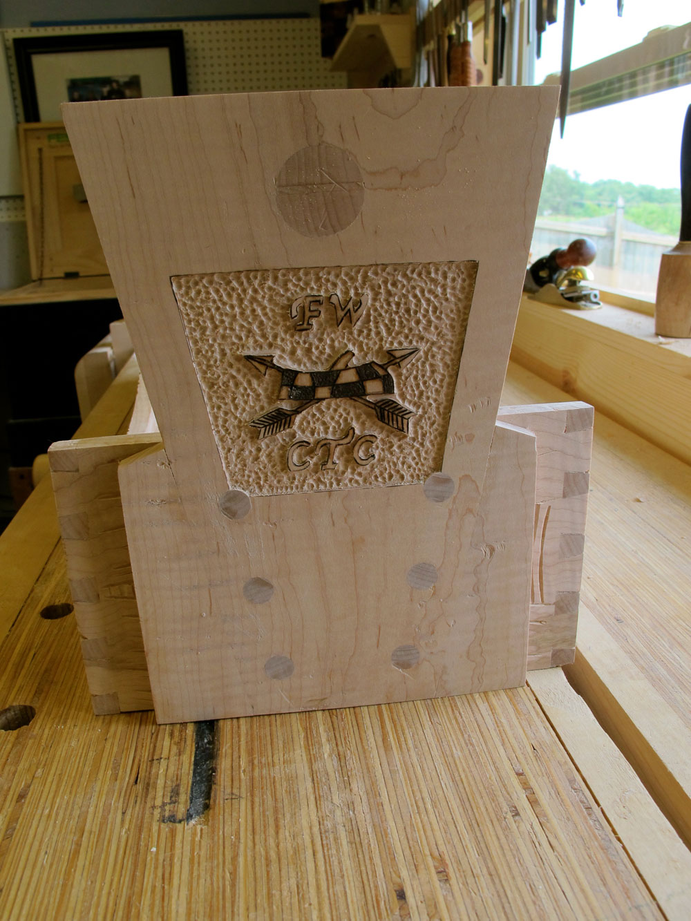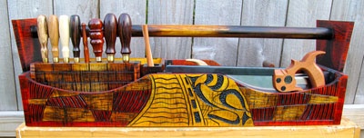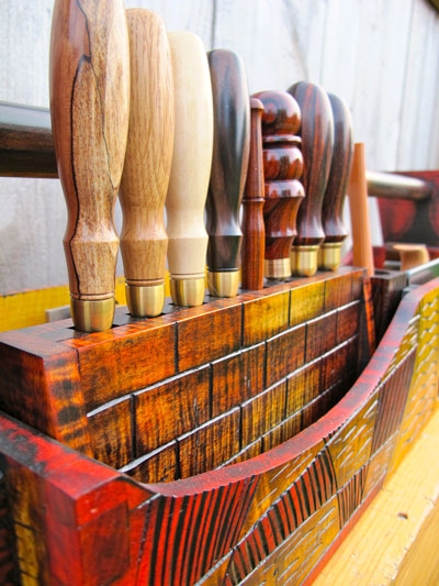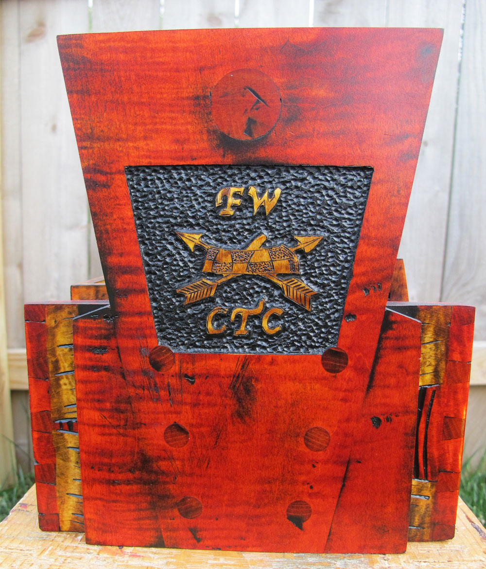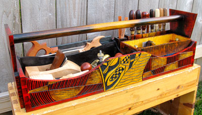 Once the carving is finished, I move onto completing the rest of the tool chest. This includes cutting the curved sides, case glue up, attaching the handle, fitting the bottom, and building the interior tool inserts. Completing the whole process is the addition of color and finish.