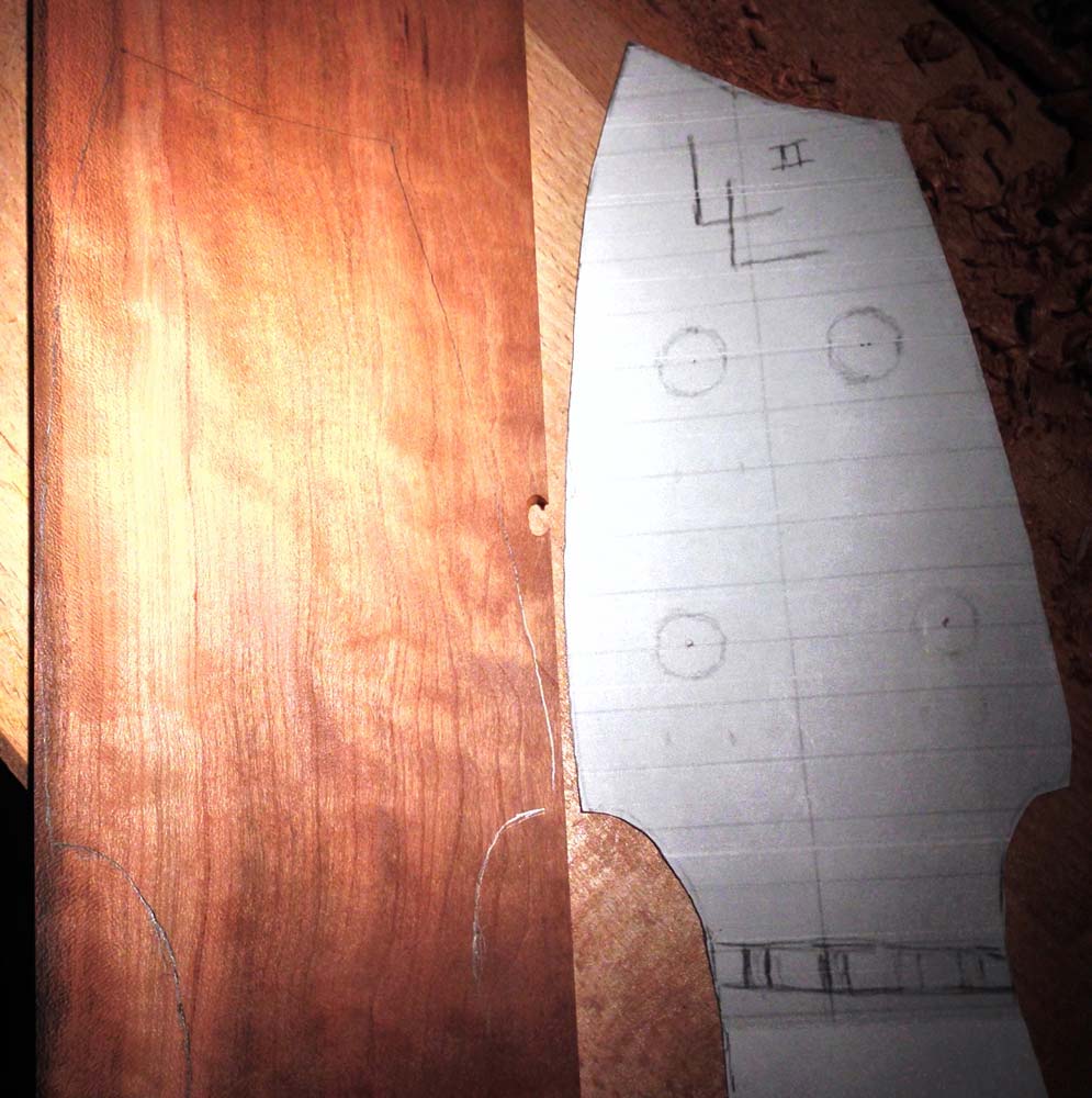I didn't drill holes for the tuners earlier, so now was the time. Before marking the locations I'd originally indicated on my template, I