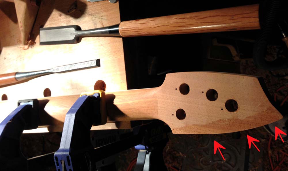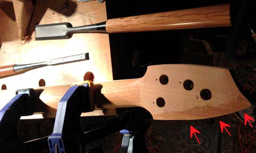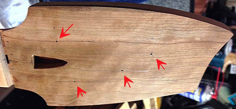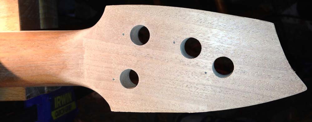small depth at each tuner, I removed the tuners, and continued to drill until down to the blue tape.
