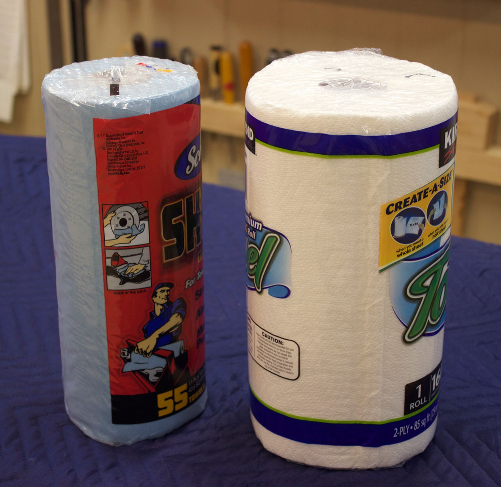 Chances are very, very good that you have at least one roll of plain white paper towels in your shop… maybe more. Chances are equally good that you also have a roll or two of those blue paper "shop" towels. If you are like me, you always grab a "cheap" white paper towel to clean the glue off your fingers or to wipe away a spill, and you choose those "more expensive" blue paper towels to degrease a machine, wipe on your rust preventive liquid du jour, dry and clean your blades while sharpening, or maybe even to wipe on a quick coat of finish (gasp!).