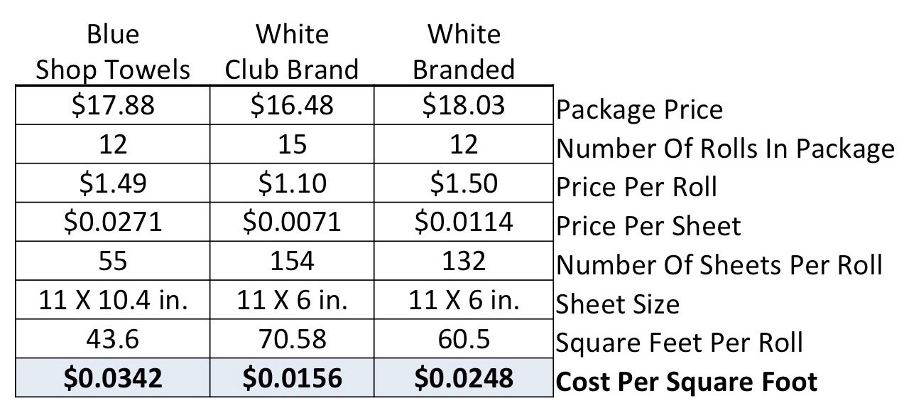 In the chart above is a comparison of prices between paper towels, all from the same wholesale "club" store. It is pretty easy to get lost in the various sizes of sheets, the number of sheets per roll, and the number of rolls per package, so the only meaningful comparison is the price per square foot (highlighted in the chart).