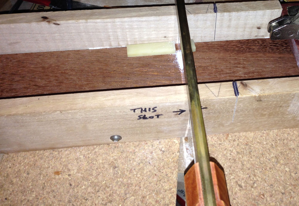 I used the same jig I made to accurately cut the slots in the fingerboard. There was no reason to change to a different saw either, as the fine cross-cut I used for the slots, leaves a decent surface.
