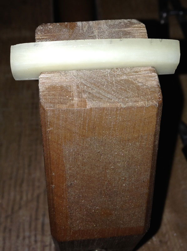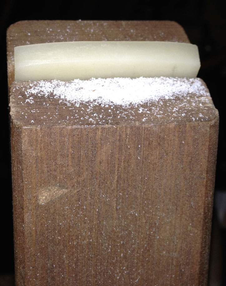 Now that the frets are good to go, I have shifted my focus to shaping the bone nut I'll use on this bass. When I received the nut, it was a small rectangular piece of bone: