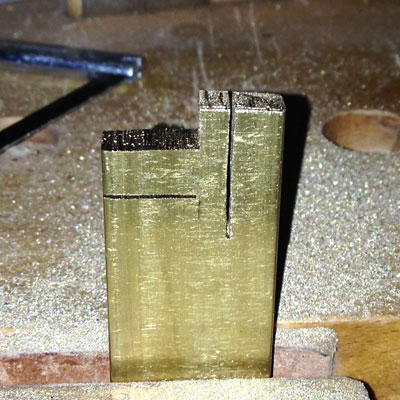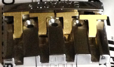 The saddles and other pieces are available from a few other companies, but I decided I would create my own saddles out of some thick brass. I found a company that sells small bars of brass, and bought one that was 1/4" thick, 1" high and 12" long. I took some measurements from the bridge, so I could mark them out on my stock. Since brass is fairly easy to work, the majority of my work was with hand tools, with just a single visit to my drill press. After marking out the saddles, I cut them out with a very small saw that was somewhat similar to a hack saw. I made sure my layout left enough extra material so I could fine tune all aspects to have a solid fit into the bridge.