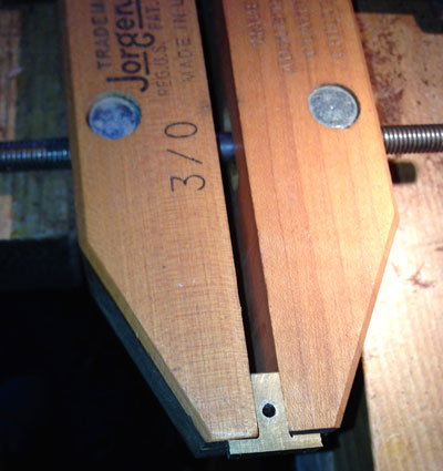 I shaped the nut so it would follow the radius of the fingerboard as well as adjusting it so the string passing over it would only touch directly above the edge of the fingerboard that meets the nut. Both shaping processes were accomplished with medium and fine flat files. I held the nut in a wooden screw clamp while holding the clamp tight in the front vise on my bench. The angled back area on the outside of both jaws (in the wooden screw) gave me easy access to the nut. (This process has also helped elevate the work, which makes it less stressful on my back.) I left the nut smooth from side to side, as I'll mark the notches for the strings a bit later after having the bridge in place, too.