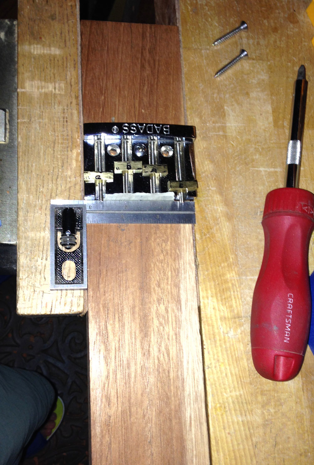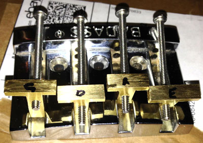 There are quite a few bass bridges available that are little more than just a thick piece of foil bent into a shape. Ok, that is somewhat of an exaggeration, but some really don't seem to do a good job of aiding in the tone or sustain. I bought a used BadAss (really, that is its name, not me using colorful language) bridge for the bass, as I've always liked the extra mass they add, as well as their solid performance. This bridge was a steal, as they reduced the price since it didn't have the four saddles, the adjustment screws, or the springs. So, basically it was just a nice piece of metal, with some holes in it, and a few grooves.