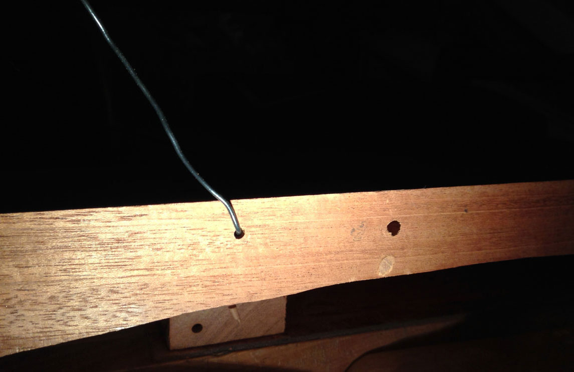 Now I was to the point where I could glue the two wings onto the center section of the bass. I fed a wire through both of the holes that I had drilled previously to make certain they didn't get glued shut by accident. I'm a bit cautious so I measured all of the holes drilled with my