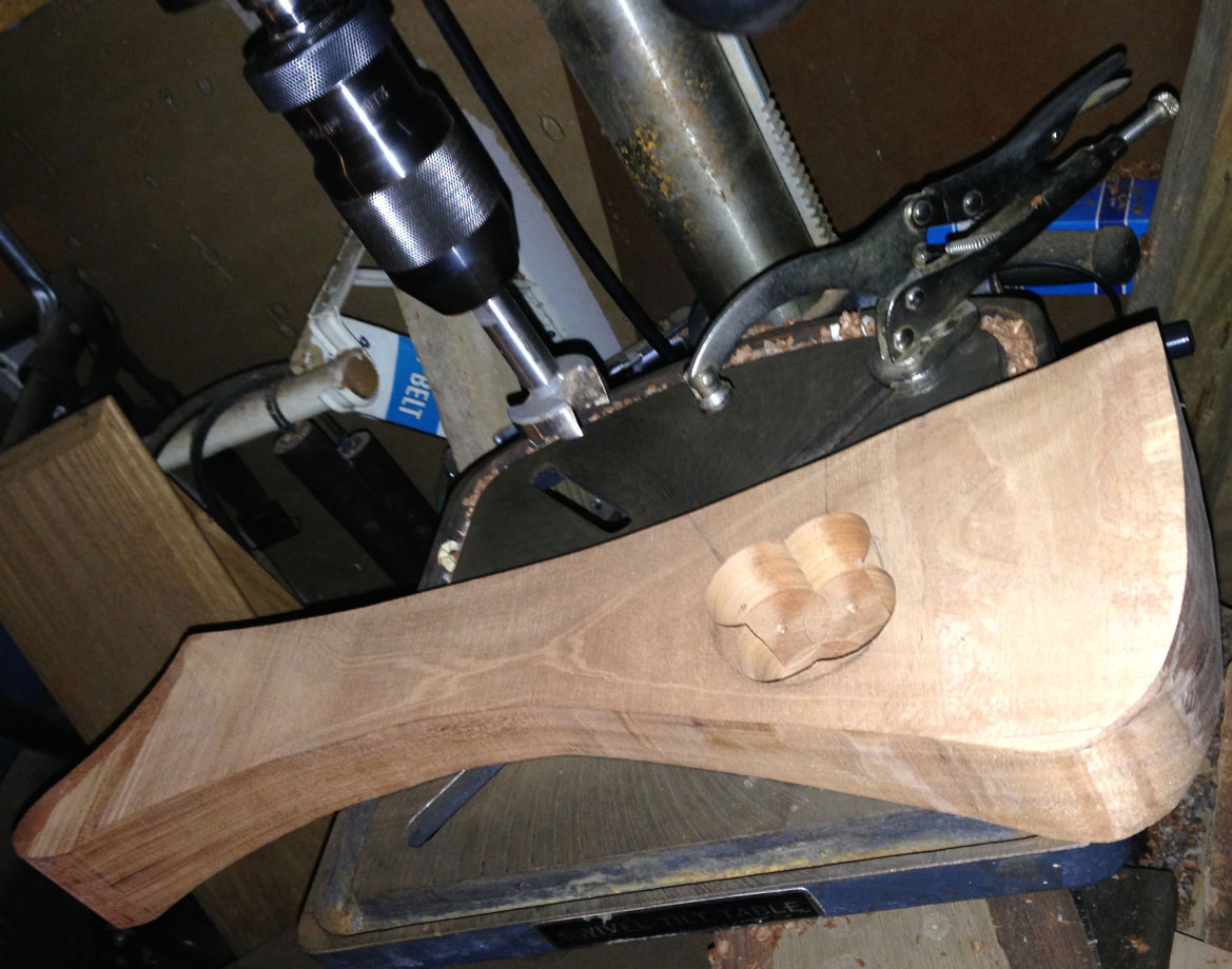 I made a similar hole, although a bit larger in diameter, for the wires that will go from the pickup to the volume knob. I used the same techniques as above. After measuring for the location where the holes would terminate, I laid out a small control cavity, and with the lower body section laying on its flat top, drilled it out with an awesome