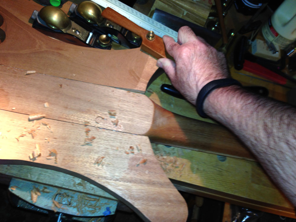 As I'd earlier removed some of the excess wood on the back of all three pieces, now it was time to start blending them together. There were a couple of locations where there was a fairly large discrepancy, but I still decided to take it down slowly with some spokeshaves, rather than trying to hog it off with a different tool and have it dive down beyond my lines. I'll still use my sander, when all the parts are of similar thickness, but find the hand tools are easier to control and more satisfying to use.