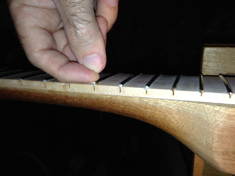 To install a fret, place the fret wire so the tang barely sits into the slot in the fingerboard. If you cut the slots with the correct sized saw, the barbs on the wire will prevent it from going very deep when sitting on the fingerboard. While holding the fret wire in place at one end (with each fret end just proud of the fingerboard) lightly tap on one end of the wire with a brass-headed hammer. As the first end seats, just work your way across the fingerboard with more light taps until the fret is completely seated. Remember, you are making a fine instrument, there should be no need to hit the frets with a 6-lb sledge hammer!