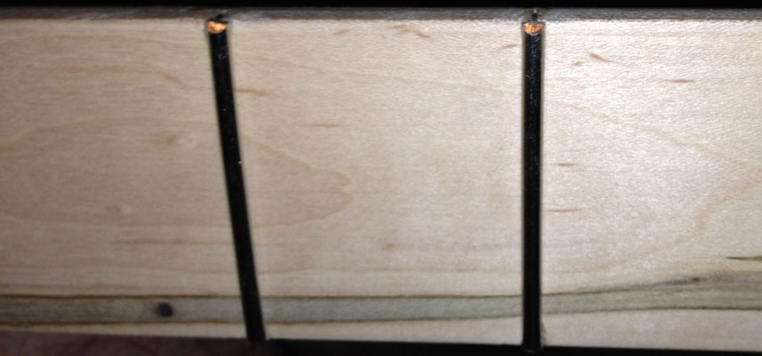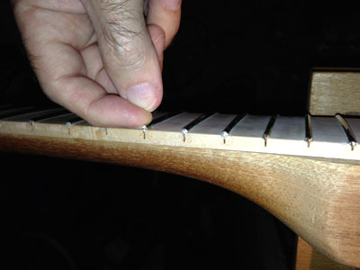 The above steps are repeated until all of the frets are in place. As an alternate method you could go through and cut all of the frets to their respective size first, and then come back and seat each one, but I've mentioned the possibility of errors with this method. Choose whichever method that works best for you.