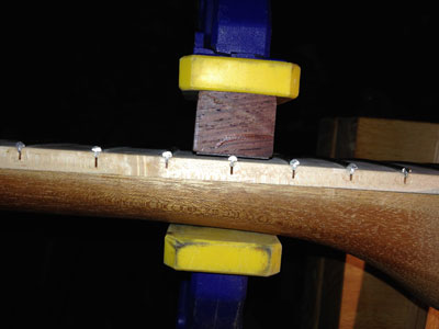Next, I like to apply some super glue to the frets so there is even less chance the frets will shift or lift out. To do this I have a small piece of dense tropical hardwood, with one face the same shape as the fingerboards radius. I applied a piece of teflon tape to the curved side in order to prevent any chance the block might get glued to the fingerboard. I place this block so the teflon covers the fret wire from side to side, and then hold it firmly in place with a non-marring clamp. While the block and clamp are in place, I flip the neck on its side, so I can drip some super glue down into the same slot as where the clamped fret is located. I use super glue that is about the consistency of water, so it doesn't just sit on the edge of the neck, but actually wicks down inside. I spray a super glue setting material onto the edge of the neck, and then rotate the neck so the other side is facing upwards. Repeat the same process on the second side. Now you can release the clamp and move on to the other frets.