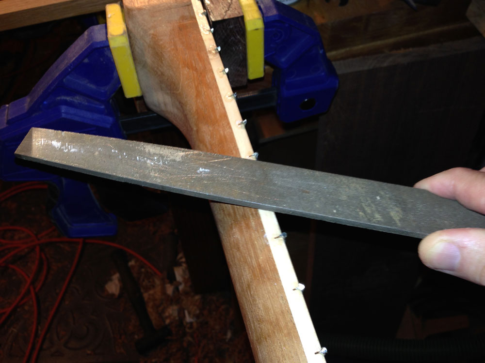 After the frets were all solid, I used a somewhat coarse file to remove the majority of the excess wire beyond the edge of the fingerboard.