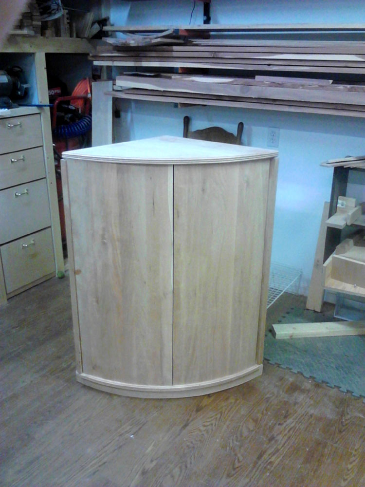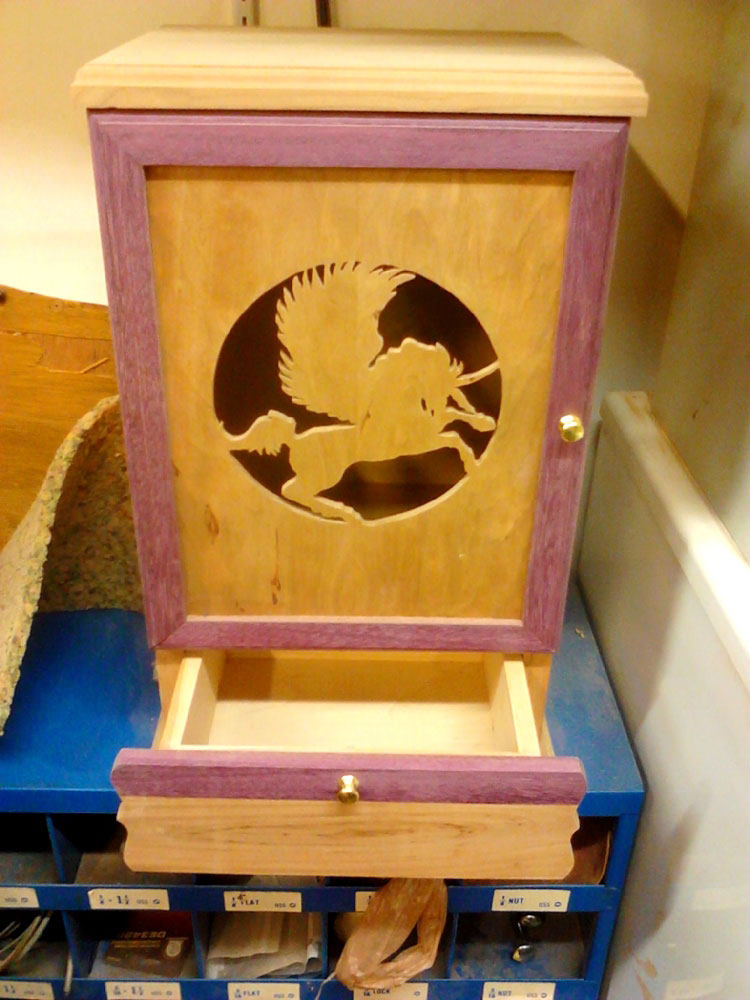 As for projects, I build whatever seems to be the thing to do at the time. Furniture, jewelry boxes, jigs, kitchen improvements… I built the rocking horse for my boy for Christmas last year. The cherry bookshelf holds a bunch of toys for now. The walnut/padauk end table is in the extra bedroom. The Pegasus jewelry cabinet is still a work in progress. The round front cherry corner cabinet was a request of my Sister and will get finished shortly.