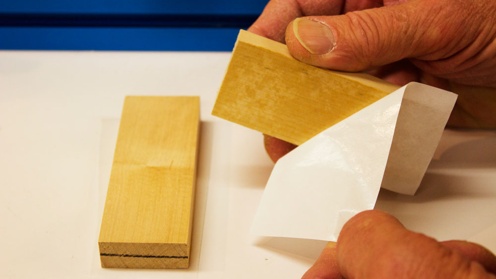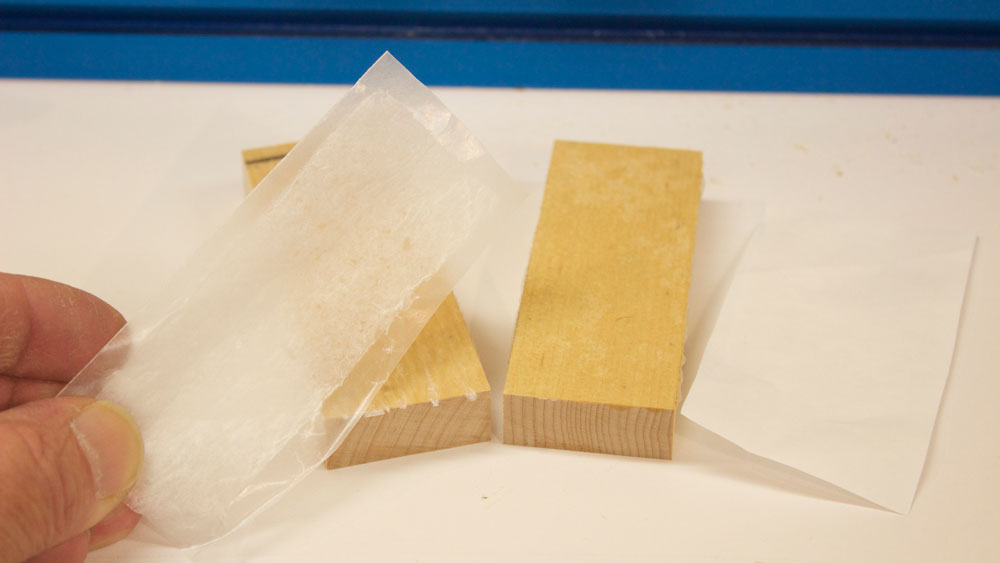 Third, I glued two scraps of maple to both waxed and freezer paper to see which would have the cleanest "release." As you can see in the photos, both pulled free of the wood easily. However, the waxed paper would be rendered unusable because the paraffin was left behind on the wood.
