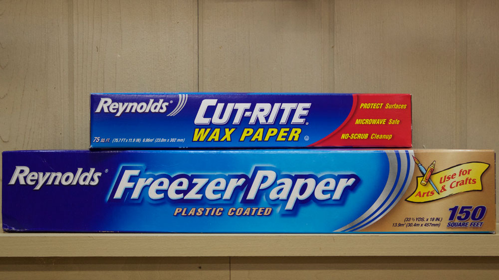 The cost difference puts a point in the waxed paper column and another point gets awarded for ease of use, since there is no need to tape down the edges. But freezer paper earns a point for thickness (strength) and another for width. Yes, yes, I know wider wax paper is available, but it is more difficult to get.
