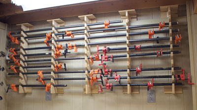 I've seen, with no exaggeration, a thousand different ways to store clamps. Some were really innovative, some were truly dumb. One annoying design required that the clamps be tightened against a rail in order to stay in place… that meant, of course, loosening the clamp to remove it from the rack. What a time waster! Spreading clamps out across a wall looks impressive, but wastes a lot of space.