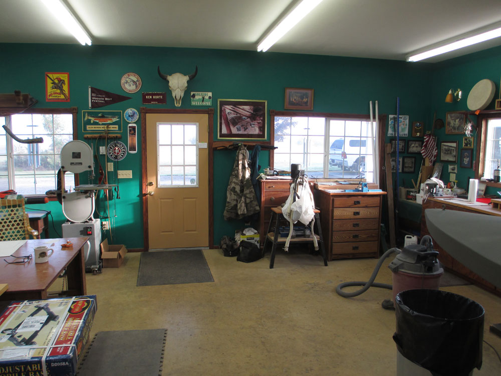 Below is the front of my workshop on a beautiful fall morning! The Delta Bandsaw was the first large tool I bought. It's over 40 years old and has survived being broken in two at the base during a 6.8 earthquake here in Olympia, WA. I still use it almost daily to cut out my bows. The old Craftsman Shop Vacuum is the most used tool in my shop. There's a Delta Mortise machine under the white cloth. Mortises were used to put all the snow shoe furniture together. Ken Korte, my father who started me in woodworking, owned a Chevron service station in Spokane. That sign that hung over the entrance to his gas station is one of my most treasured possessions.