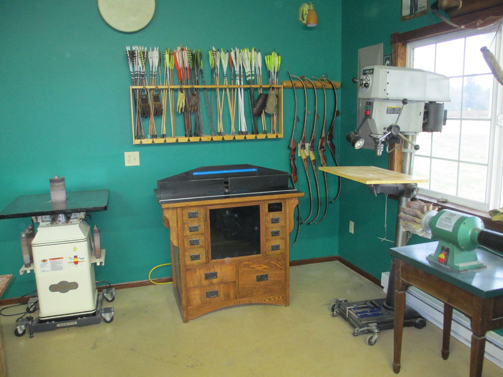 in shaping the risers in my longbows and recurves. I built the oak router table in Mission style from Norm Abram's New Yankee Workshop plans. My Delta Drill Press and the Grizzly Flap Sander are used almost daily. I made all the arrows shown on the rack. Many are made of Port Orford Cedar, and some are made of Douglas Fir which I shaped using a simple jig and my router table.