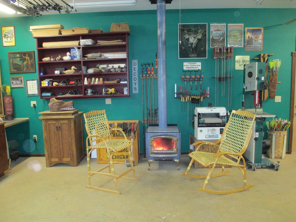 I made the snowshoe chairs below when I built a western-themed drift boat a few years ago. They are laminated Ash with nylon webbing, with several coats of polyurethane, making them look like rawhide. I collect and restore old duck decoys and sold many of my own carved decoys throughout the years. I love to build traditional archery gear, including longbows, recurve bows, and Port Orford Cedar arrows.